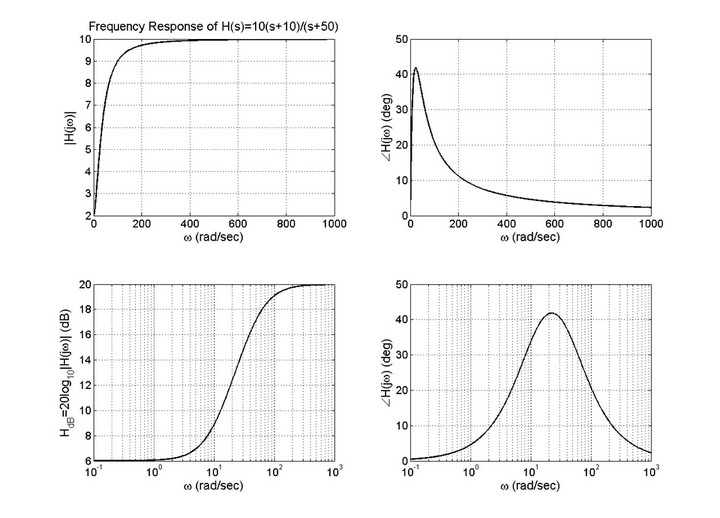 >> title('Frequency Response of H(s)=10(s+10)/(s+50)');