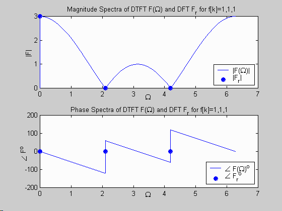 title('Magnitude Spectra of DTFT F(\Omega) and DFT F_r for f[k]=1,1,1');