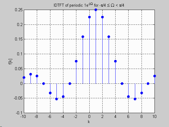title('IDTFT of periodic 1e^{-j\Omega} for -\pi/4 \leq \Omega < \pi/4')
