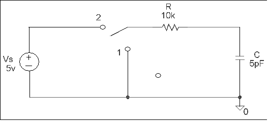 Unlike last week, the voltage source you will use will be a 0 to 5v pulse signal (Vpulse). The purpose of the pulse is to model a switch opening and closing. When the pulse is low (0 volts), the switch is modeled as open and when the pulse is high (5 volts), the switch is modeled as closed. You will need to define the parameters of the pulse. For the purpose of this exercise, you will inject a waveform that is 5 volts for the first 500 ns and 0 volts for the next 500 ns. To accomplish this, double click on the Vpulse symbol and enter the following attributes: V1 = 0V, V2 = 5V, TD = 0, TR = 0, TF = 0, PW = 0.5us, and PER = 1us. (TR = risetime, TF = falltime, TD = delay time, PW = pulse width, and PER = period of waveform)