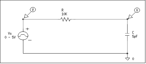 Notice there are two voltage level markers on the schematic. These are used in the probe feature of PSPICE. Probe allows the user to observe how a circuit affects a signal. Specifically, you will observe how a 5 volt source charges the capacitor in an RC network (and how the capacitor discharges in the same network). Place the voltage markers on your schematic--one to measure the source voltage and one to measure the capacitor voltage (under the Markers menu, choose Mark Voltage/Level).
