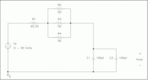 where VC represents the capacitor voltage, VT the maximum capacitor voltage, and RC the time constant for the circuit. Another rule of thumb states that it takes the time of 5 time constants for a capacitor to "fully" charge or discharge. This value would be 250 ns for this circuit. Substituting the known quantities of t = 250 ns, RC = 50 ns, and VT = 5 volts into equation (1) results in VC = 4.97 volts, or 99% of the maximum possible voltage.