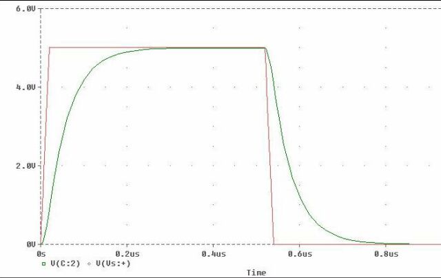 Notice that while the pulse reads 5 volts from 0 s to 500 ns, the capacitor is shown to be charging, while during the low portion of the pulse wave (500 ns to 1 us) the capacitor is discharging.