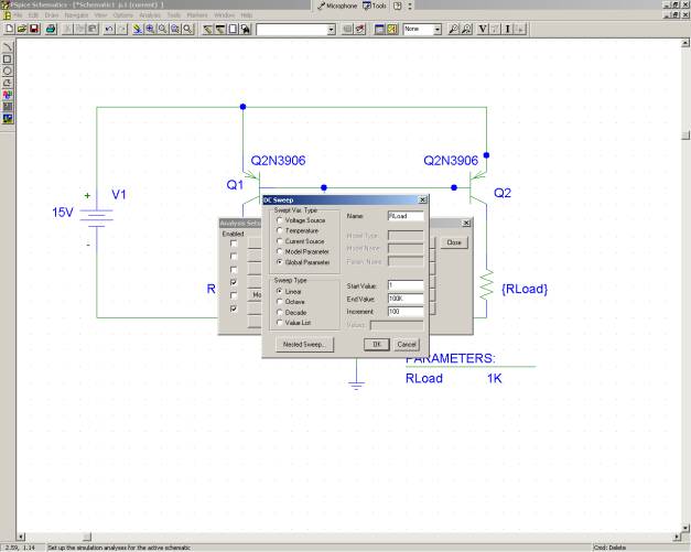 13)We now need to set up the DC Sweep, click on Analysis -> Setup, a menu will show up, check DC sweep and click on the button.