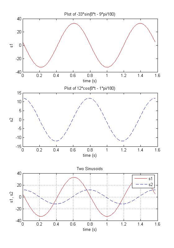 xlabel('time (s)'); ylabel('s2'); title('Plot of 12*cos(8*t - 1*pi/180)');