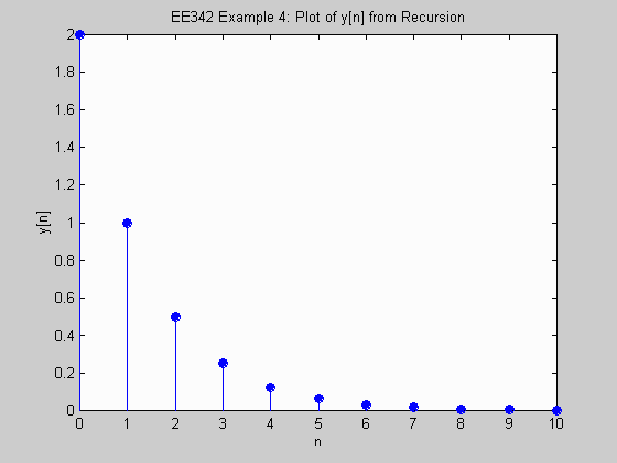 title('EE342 Example 4: Plot of y[n] from Recursion');
